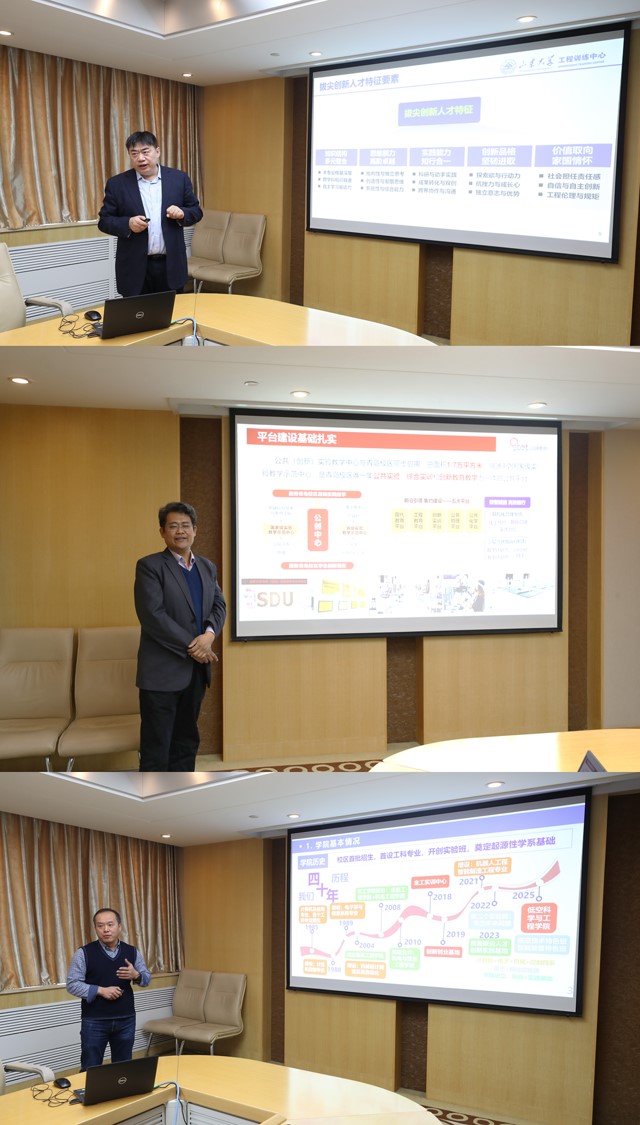 为实现四新建设背景下创新实践教育新生态的构建,12月12日,山东大学一校三地创新实践育人能力提升研讨会在中心校区召开。山东大学党委常委、副校长曹现强出席会议,上海交通大学巴黎卓越工程师学院党委书记熊振华,大连理工大学工程训练中心主任、创新创业学院院长兼党委书记刘新,山东大学本科生院副院长杨明,青岛校区资产与实验室管理处处长刘健,公共(创新)实验教学中心主任彭朝晖,低空科学与工程学院副院长宋勇,工程训练中心主任宋锐、副主任姜兆亮、副处级组织员刘新,资实部实验室规划建设办公室副科长王茂鑫,本科生院专业建设工作负责教师王丽,低空科学与工程学院金工实习负责人孙蛟,工程训练中心主任助理曹利华参加研讨会。会议由工程训练中心党总支书记孙玉玲主持。