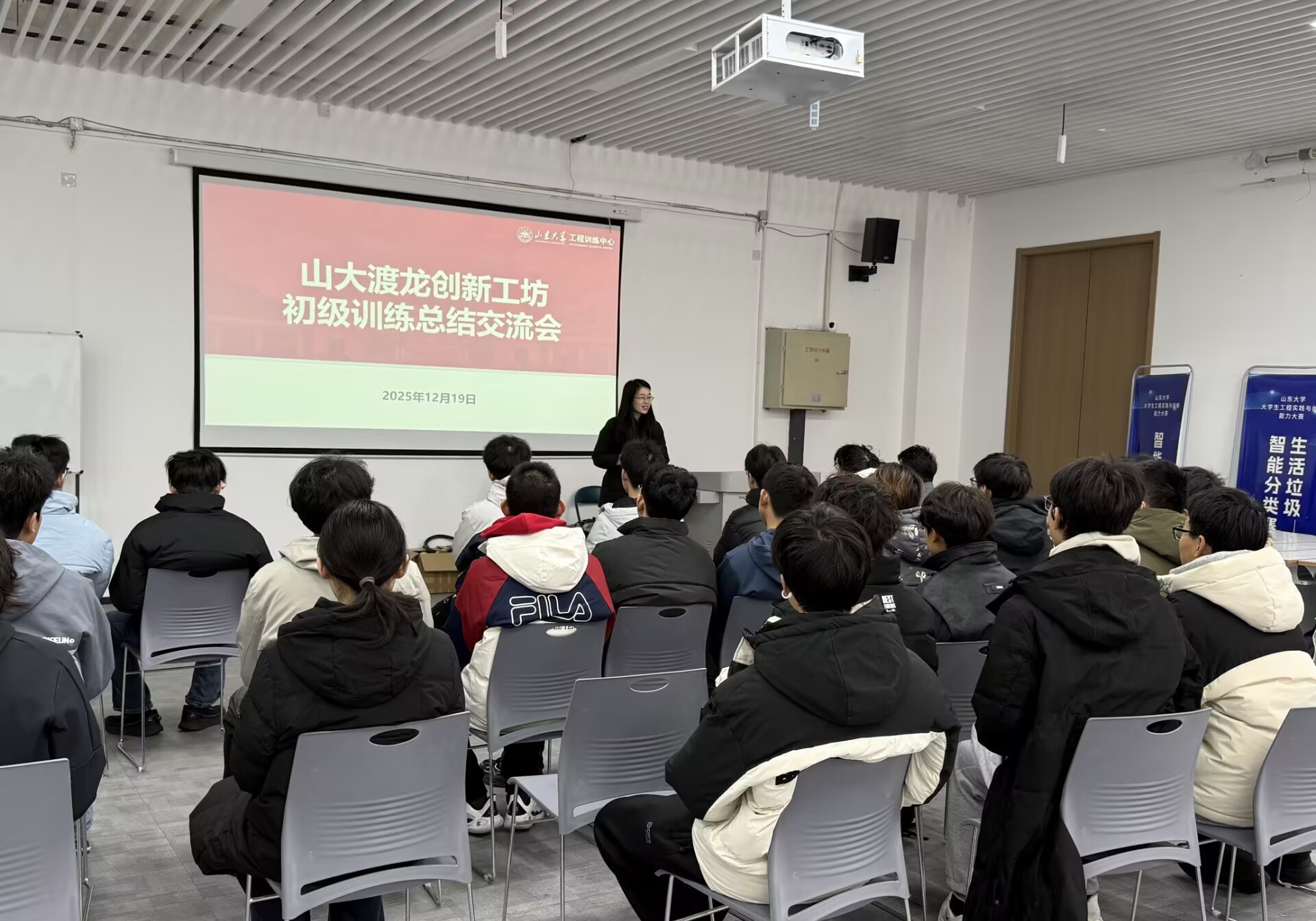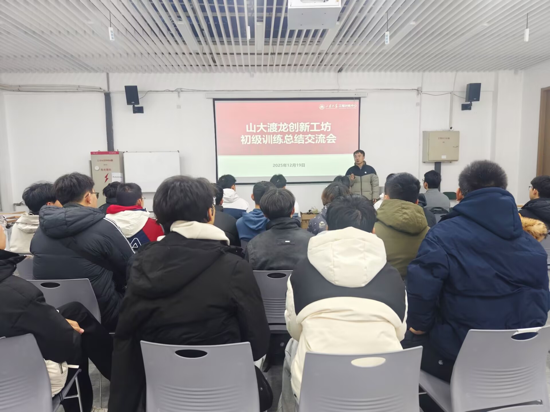 12月19日,“渡龙创新工坊初级训练总结交流会”在工程训练中心301举行。柴锦老师介绍了工程训练中心“竞赛驱动、层次递进、项目贯通”的培养体系,她指出,工坊的培养不局限于单一竞赛,而是通过系统的项目训练、开放的平台支持和持续的校内外导师指导,为学生提供从基础夯实到创新突破的完整成长路径,助力大家逐步构建工程素养与系统化思维。管吉冬老师结合初级训练典型案例,讲解了问题拆解、模块化设计与系统调试等方法,他强调,工坊学习的价值不仅在于完成单个作品,更在于掌握可迁移的工程思维与实验方法——包括严谨的逻辑推演能力和自主搭建测试系统的实践能力,这些都是未来投身科研、参与竞赛或走向产业创新的必备基础。
