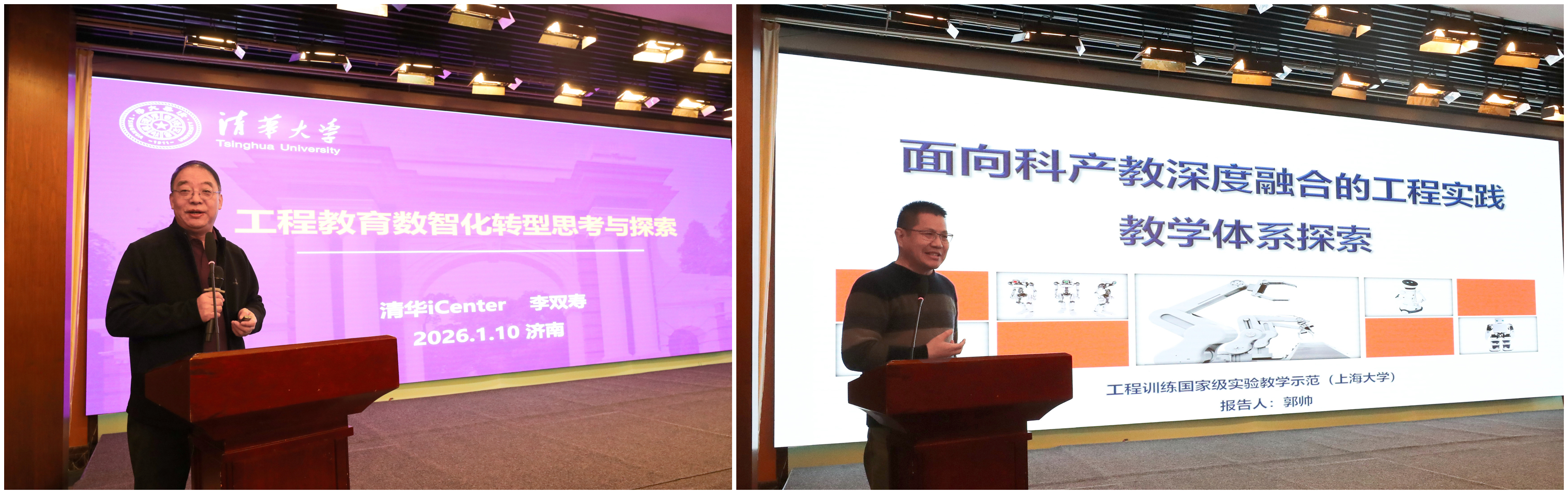 会议期间,清华大学李双寿教授作题为《工程教育数智化转型思考与探索》的特邀报告,分析了新质生产力背景下教育数智化新要求,回顾了工程教育与工程训练的发展历程,介绍了清华iCenter数智化转型探索的典型经验。上海大学郭帅教授作题为《面向科产教深度融合的工程实践教学体系探索》的特邀报告,介绍了上海大学工程训练中心在实践平台建设、产教融合发展、创新创业教育方面的经验和成效,并就工训中心如何推进教育科技人才一体化发展的理念思考与路径探索等进行了分享。