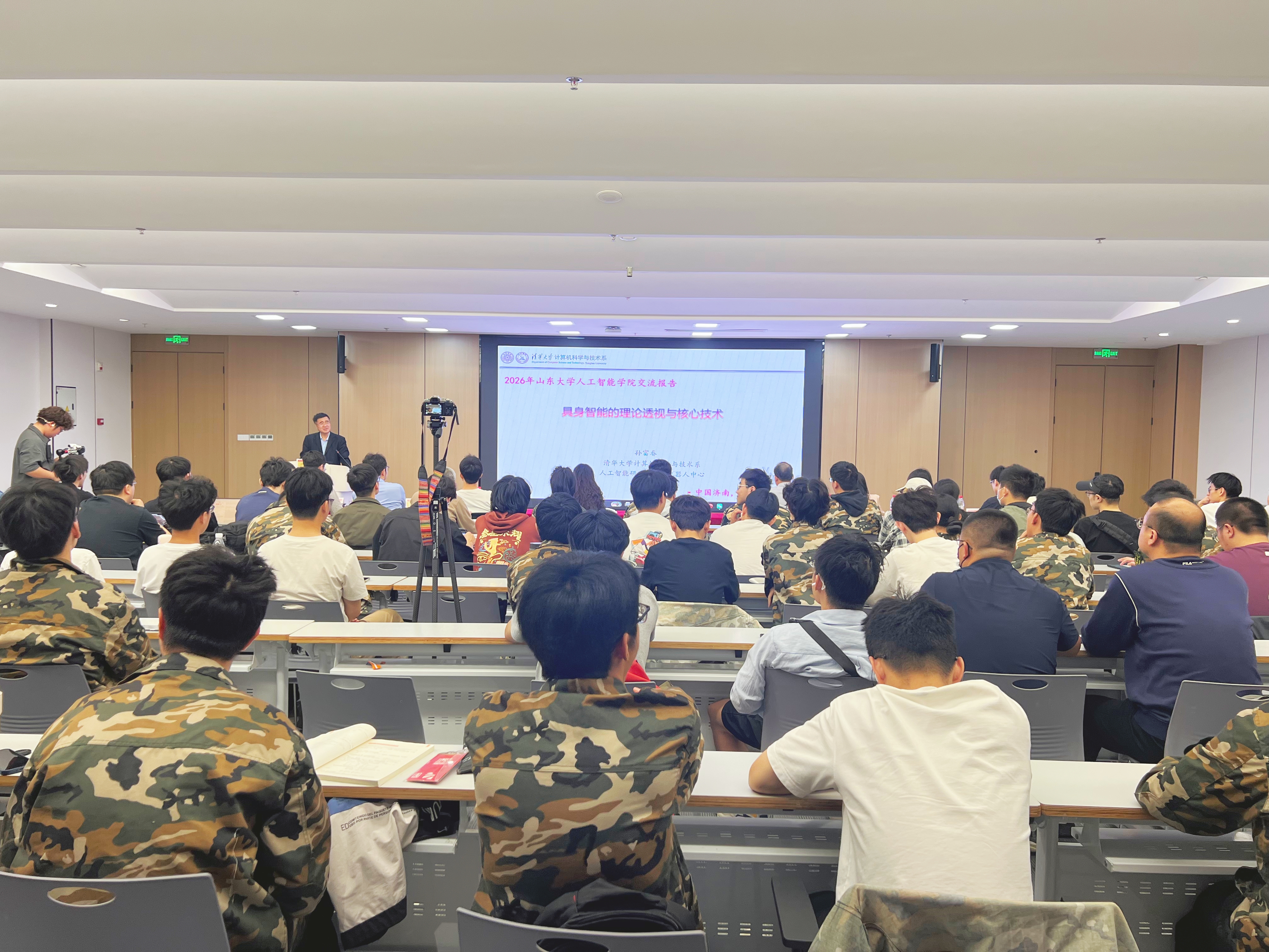 孙富春教授以《具身智能的理论透视与核心技术》为题,围绕具身智能理论、核心技术突破、智能体构建等核心内容展开系统讲解。他从具身智能理论框架出发,深入剖析具身智能的前沿进展,结合灵巧操作的技术实践,展望了其在产业应用中的广阔前景。整场报告既有理论高度,又具实践深度,不仅拓宽了师生的学术视野,更激发了大家投身交叉学科研究的热情。