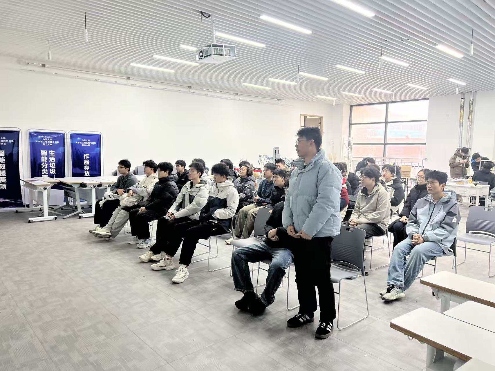为进一步深化校企合作、协同育人,工程训练中心于2022年与青岛澳氏渡龙创投有限公司合作共建山东大学澳氏渡龙创新工坊,致力于打造服务于学生的智能工程与创新创业产教融合平台;2024年成立山东大学学生智能工程创新社,社团成立以来,通过科技竞赛与项目研发培养成员的实践能力和创新精神,逐步形成了“基础—进阶—创新—创业”四阶体系。