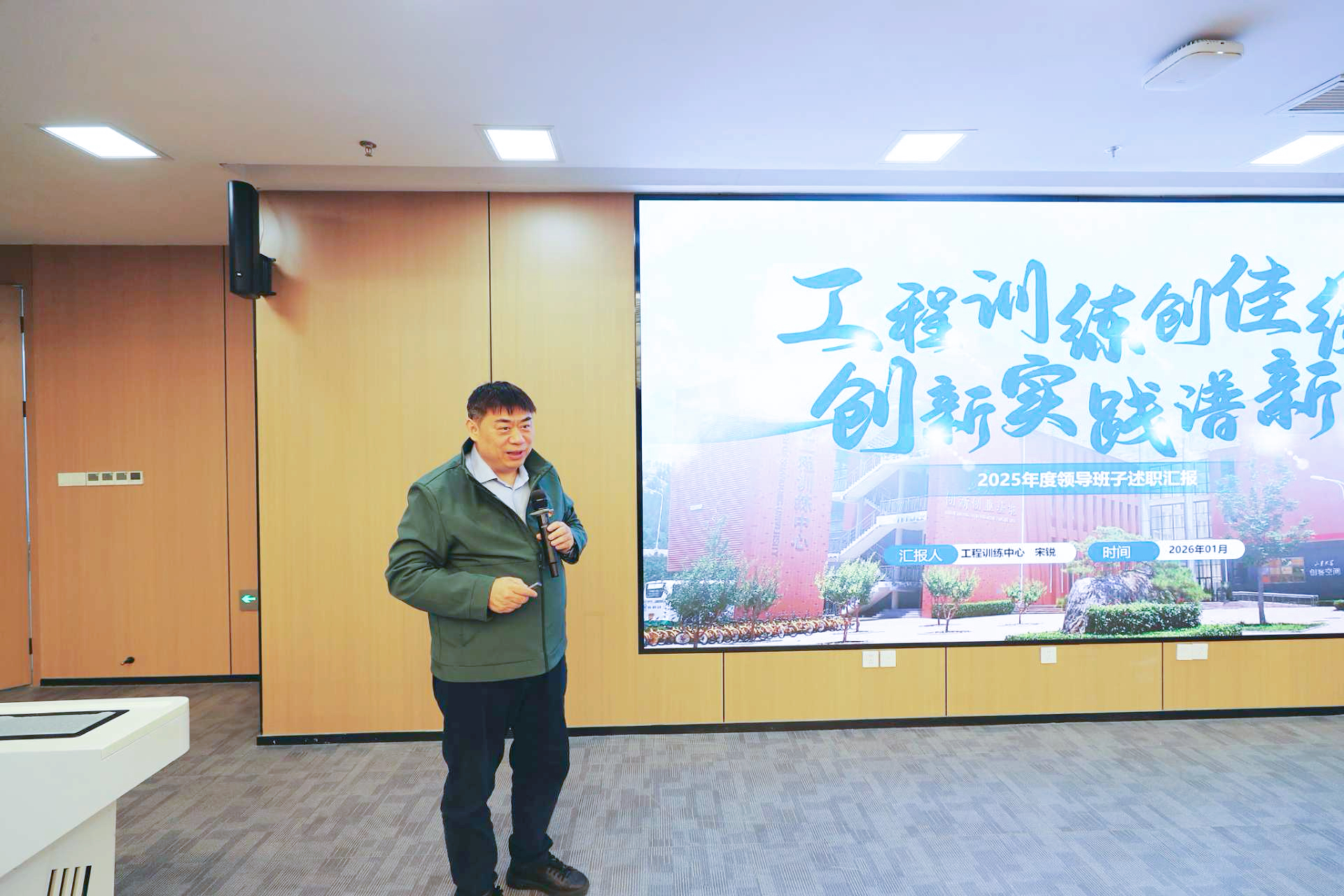 中心主任宋锐代表领导班子以“工程训练创佳绩,创新实践谱新篇”为题,围绕2025年度中心在党建引领、人才培养、教学改革、科研突破、产教融合等方面的进展进行了述职。他提到,过去一年中心紧紧围绕立德树人根本任务,高质量开展深入贯彻中央八项规定精神学习教育,持续深入学习贯彻习近平新时代中国特色社会主义思想、党的二十大和二十届历次全会精神、《教育强国建设规划纲要(2024-2035年)》精神及学校第十五次党代会精神,以“融、升、创”党建模式赋能中心事业发展,在构建创新实践育人新范式、建设“1+N”劳育课程体系、推进数智赋能“师-机-生”协同生态、加速科研成果转化、创新校企协同机制、服务社会等方面取得了系列成效。他系统分析了中心事业发展目前面临的机遇与挑战,进一步明确了下一步的改革发展目标。他强调,2026年是“十五五”开局之年,中心将紧扣“创新实践中心转型、数智化深度赋能、科研教学协同”三大攻坚方向,以龙山校区建设为契机,深化“一体化融合、高阶性提升、数智化赋能”,全力推动功能定位从“工程训练”向“创新实践”转型升级,为学校加速实现“全面图强”贡献力量。